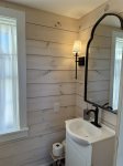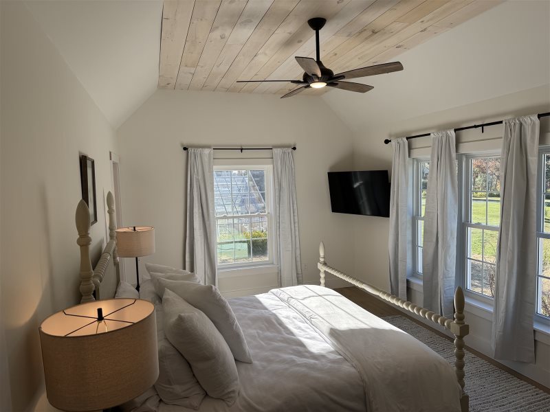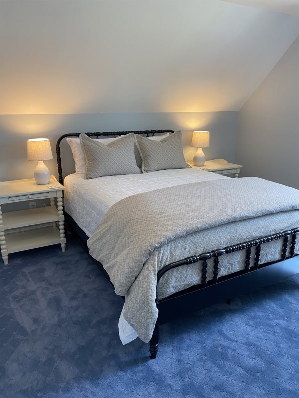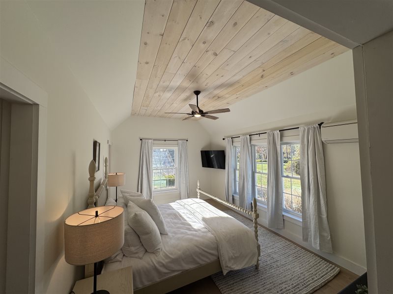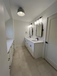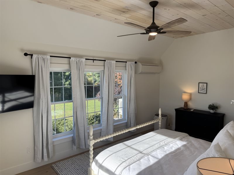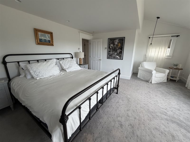 As you enter the home, you will be in the large, deluxe kitchen equipped with all-new appliances and amenities to cook up a feast. Folks can sit at the counter or in the comfortable chairs to converse with those preparing, or at the dining table to play cards. Around the corner is the living room, set up with ample seating and a new, large, flat-screen Smart TV for an evening movie, as well as a convenient laundry room. On the other side of the living room is a new king bedroom with an ensuite full bathroom and TV, and a full bedroom on the other side of the staircase. There is a new half bath near the house's entry.