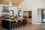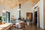 One Floor Living- Open Floor plan- Kitchen overlooking Dining area and Living Room, Second living room with 65in Smart TV, King Bedroom with ensuite Full Bathroom, and Queen Bedroom with Twin loft bunk bed with ladder (just top), additional twin on the ground level with ensuite Full Bathroom