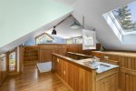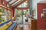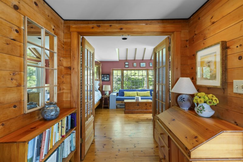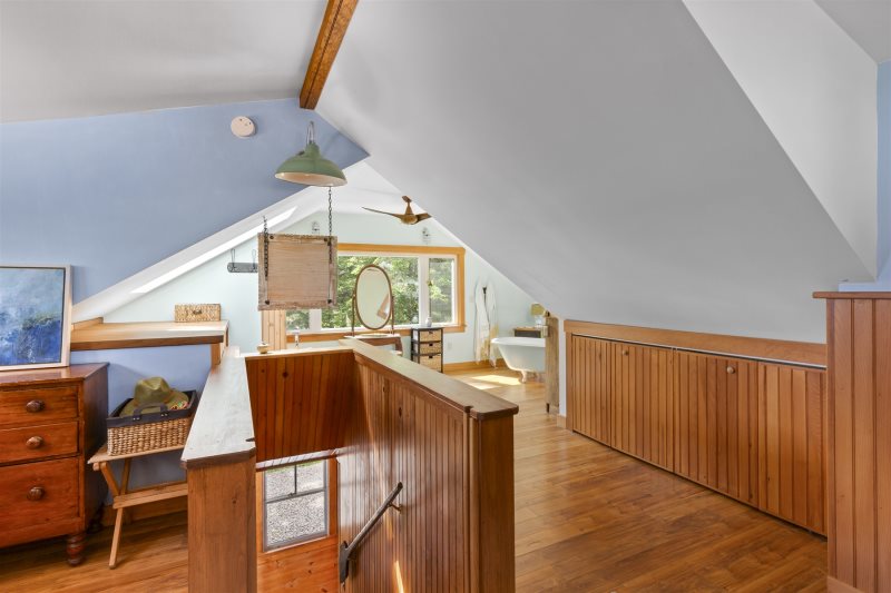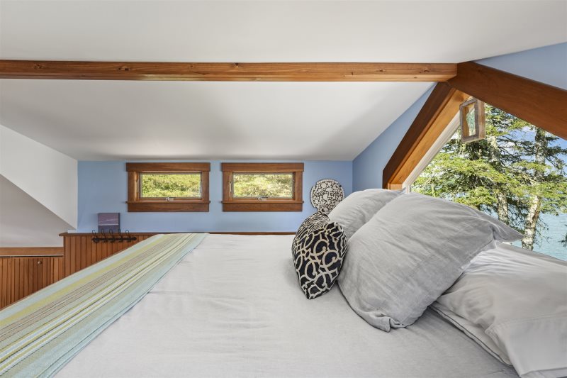 The comfortable space includes a kitchen, living/dining area with views of the river, and surrounding woods on the first floor. There is a queen bedroom with adjoining full bath with stall shower that can also be accessed from the hall. Up the wooden stairs you will find an elevated king platform bed that will make you feel like you are in a ship at sea with the water view.