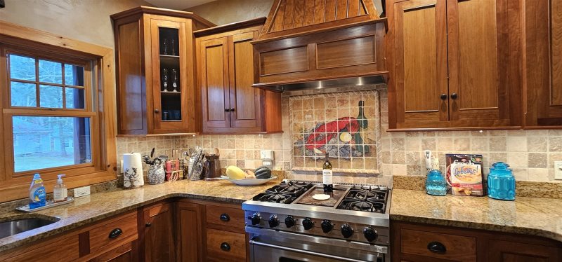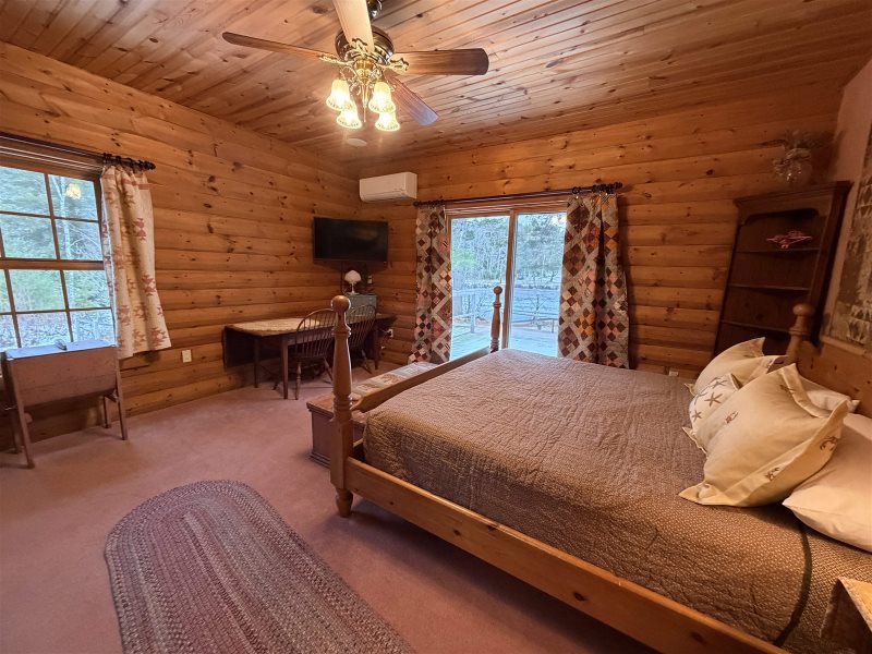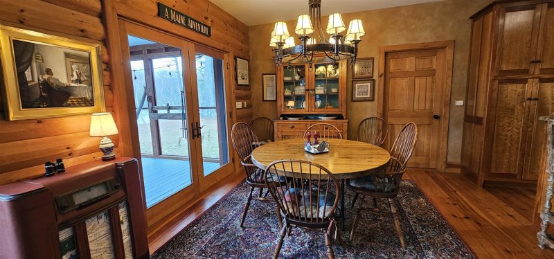 This newer log home, situated on the banks of the Megunticook River, is a luxurious vacation getaway in one of Maine's most desirable seaside communities. The home includes a custom-designed gourmet kitchen, a spacious living room with cathedral ceilings, a screened porch and deck, and a large, well-landscaped, fenced yard.